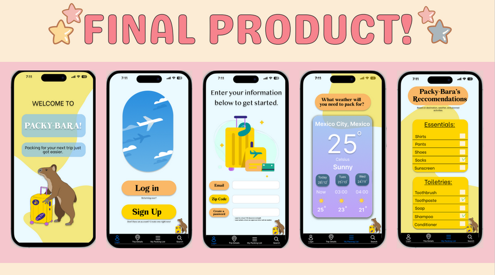 packybara is an app designed to help users pack and organize for trips. it comes with a list of customizable features such as travel activites, weather and custom made lists. this was my teams final prototype for the ui/ux club, design interactive during winter quarter of 2023.